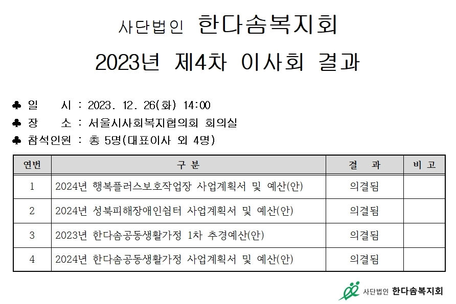 2023년 4차 사단법인 한다솜복지회 이사회 결과